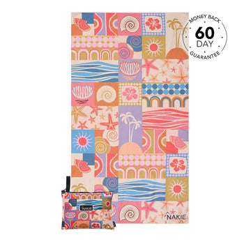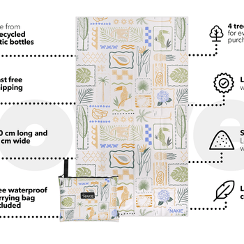 We pride ourselves on our eco-approach and sustainability is at the heart of Nakie's mission. We plant four trees for every purchase, are B-corp certified and we are Oeko-Tex Standard 100 certified. These beach towels are made using 86% recycled plastic bottles - that's up to 56 bottles saved from landfill and our oceans per towel!