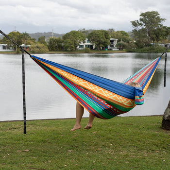 Our hammocks are 3m long by 1.8m wide making sharing your hammock an absolute dream.The extra width means you can easily fit two people and swing in the breeze together! If you are on the taller size you will love the extra width as it makes sure you can have a comfy solo sleep in our recycled hammocks!