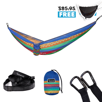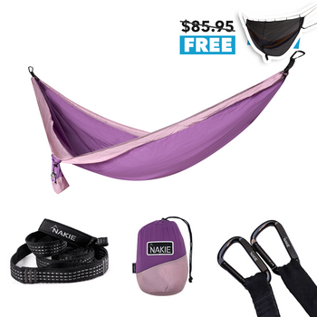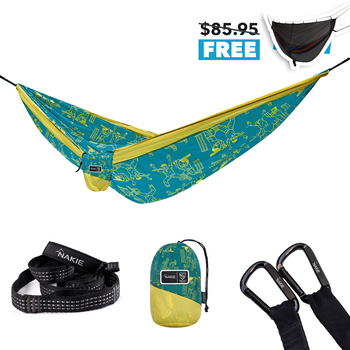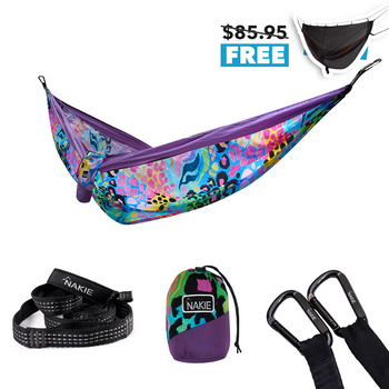 View full detailsJust yourself and two trees! Each Nakie hammock comes standard with no knot straps and carabiners for an easy no fuss set up. You do not need any extra equipment. Setting up your own hammock is very easy. Our current record is 27 seconds! With our no fuss straps and carabiners you won’t need to tie a single knot. Setting up a Nakie hammock is straightforward. Here’s how to do it in a few simple steps: - Find Two Anchor Points: Look for two sturdy trees (or posts) about 10-15 feet apart. Ensure they’re healthy and can support your weight—trees should be at least 6 inches in diameter to avoid damage or risk - Loop the Straps: Take the provided tree straps and wrap each one around a tree at about head height (around 5-6 feet up). Feed the end of the strap through its own loop and pull tight to secure it. Nakie hammocks come with reinforced straps designed to be tree-friendly, so they won’t harm the bark. - Attach the Hammock: Clip each end of the hammock to the straps using the included carabiner clips. Nakie straps have multiple loops, so you can adjust the tension by choosing different loops—start with one in the middle. - Test and Adjust: Sit in the hammock to check the height and comfort. The middle should hang about hip level, with the ends at head height, to create a cozy curve. If it’s too low or tight, adjust the clips on the straps or raise/lower the straps on the trees.