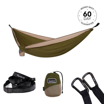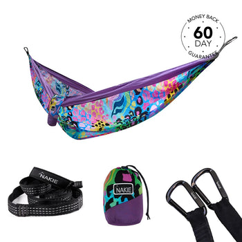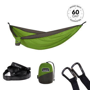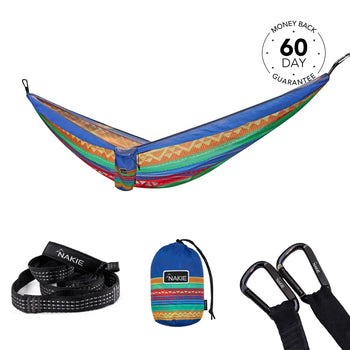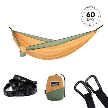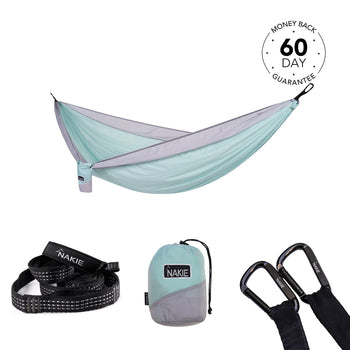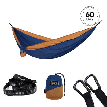 Just yourself and two trees! Each Nakie hammock comes standard with no knot straps and carabiners for an easy no fuss set up. You do not need any extra equipment. Setting up your own hammock is very easy. Our current record is 27 seconds! With our no fuss straps and carabiners you won’t need to tie a single knot. Setting up a Nakie hammock is straightforward. Here’s how to do it in a few simple steps: - Find Two Anchor Points: Look for two sturdy trees (or posts) about 10-15 feet apart. Ensure they’re healthy and can support your weight—trees should be at least 6 inches in diameter to avoid damage or risk - Loop the Straps: Take the provided tree straps and wrap each one around a tree at about head height (around 5-6 feet up). Feed the end of the strap through its own loop and pull tight to secure it. Nakie hammocks come with reinforced straps designed to be tree-friendly, so they won’t harm the bark. - Attach the Hammock: Clip each end of the hammock to the straps using the included carabiner clips. Nakie straps have multiple loops, so you can adjust the tension by choosing different loops—start with one in the middle. - Test and Adjust: Sit in the hammock to check the height and comfort. The middle should hang about hip level, with the ends at head height, to create a cozy curve. If it’s too low or tight, adjust the clips on the straps or raise/lower the straps on the trees.